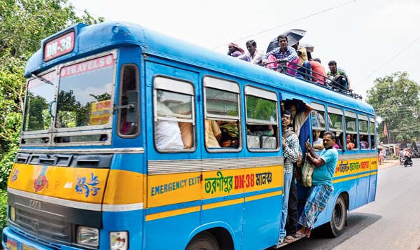 বসিরহাটে বাসে গাদাগাদি করে যাচ্ছেন পরীক্ষার্থীরা। ছবি: নির্মল বসু
