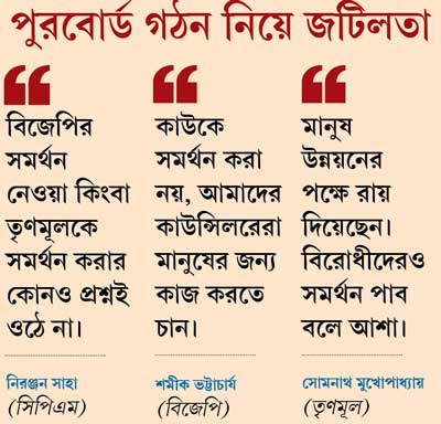 সব পক্ষের চাপানউতোর থেকে এ কথা স্পষ্ট, বোর্ড গঠনে স্বচ্ছতা রাখার মাথাব্যথা কারও নেই। তৃণমূলের ক্ষেত্রে আবার অন্য সমস্যাও আছে। সোমনাথবাবু ছাড়াও জয়ী কাউন্সিলরদের মধ্যে আরও কেউ কেউ পুরপ্রধানের পদের দাবিদার হয়ে বসেছেন। দলের উপর মহলে নানা রকম তদ্বিরও শুরু করেছেন তাঁরা, জানাচ্ছে তৃণমূলেরই একটি সূত্র।