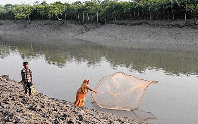 সুন্দরবন-লাগোয়া সন্দেশখালিতে মাছ ধরছেন মহিলা। নিজস্ব চিত্র।