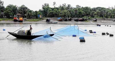 জাল ফেলেছেন মৎস্যজীবীরা। কাকদ্বীপে শশাঙ্ক মণ্ডলের তোলা ছবি।