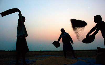 ধান ঝাড়ার পর কুলোর হাওয়ায় ওড়ানো হচ্ছে ধানের কুঁড়ো। কাঁকিনাড়ার মুকুন্দপুরে। ছবি: সজল চট্টোপাধ্যায়
