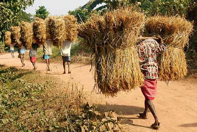ঘরে ফেরার পথ...। খেত থেকে খড় কেটে ফিরছেন চাষিরা। কদম্বগাছিতে সুদীপ ঘোষের তোলা ছবি।