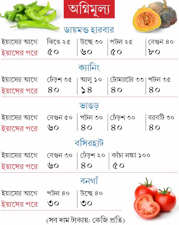 বসিরহাট শহরে ইয়াসের আগে বেগুনের দাম ছিল ৩০ টাকা প্রতিকেজি। এখন বেড়ে হয়েছে ৬০ টাকা। পটল ও ঢ্যাঁড়শের দাম ২০ টাকা থেকে বেড়ে হয়েছে ৪০ টাকা। একমাত্র কাঁচা লঙ্কার দাম কমেছে। ইয়াসের আগে দাম ছিল ১০০ টাকা কেজি। এখন হয়েছে ৫০