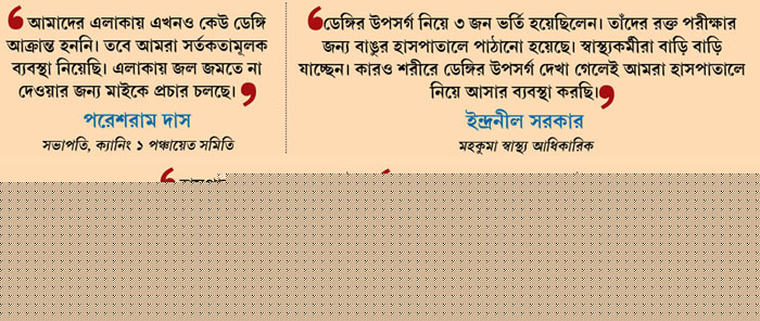 • ক্যানিং মহকুমা হাসপাতালে সম্প্রতি চালু হয়েছে সিসিইউ। ডেঙ্গির রক্ত পরীক্ষার ব্যবস্থাও নেই। রিপোর্টের জন্য পাঠাতে হয় কলকাতার বাঙুর হাসপাতালে। রিপোর্ট আসতে দেরি হয়।