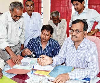 মনোনয়ন জমা দিচ্ছেন ১ নম্বর ওয়ার্ডের বিজেপি প্রার্থী সুভাষ সাহা (একেবারে বাঁ দিকে)।
