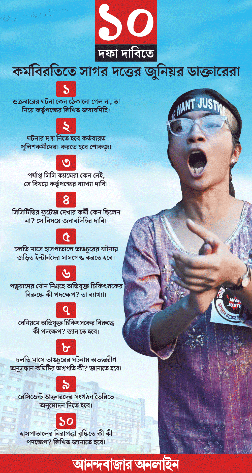 তাঁদের বক্তব্য, হাসপাতালে চিকিৎসকদের বিশ্রামকক্ষের বাইরে কোনও সিসি ক্যামেরা নেই। সেই কারণে ওই জায়গার ফুটেজ পাওয়া যায়নি। সিসিটিভির ফুটেজে নজর রাখার জন্যও কেউ ছিলেন না বলে অভিযোগ জুনিয়র ডাক্তারদের। সুপ্রিম কোর্ট যে ডাক্তারদের মনে আস্থা ফেরানোর বার্তা দিয়েছে, সে কথাও মনে করিয়ে দেন সাগর দত্তের জুনিয়র ডাক্তারেরা। তাঁরা বলেন, “পুলিশ ফাঁড়িতে অভিযোগ জানাতে গেলে বলা হয়, এখানে এফআইআর করা হয় না। থানায় যেতে বলা হয়। কলেজ কাউন্সিলের বৈঠকে তাঁরা (কর্তৃপক্ষ) স্বীকার করে নিয়েছেন ব্যর্থতার কথা। কিন্তু কর্তৃপক্ষ কোনও জবাব দিতে পারেনি।”
