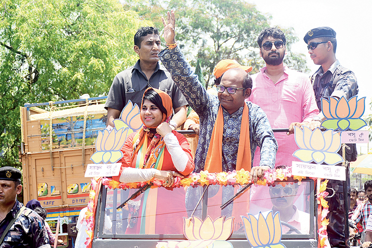 বসিরহাটের বিজেপি প্রার্থী সায়ন্তন বসু। সঙ্গে ভারতী ঘোষ। নিজস্ব চিত্র