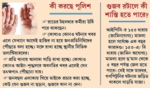 জেলা পুলিশের এক কর্তার কথায়, ‘‘আমরা মাইকে প্রচার চালাচ্ছি। এলাকায় গিয়েও লোকজনকে বোঝাচ্ছি। কিন্তু আমাদের সামনে হয় তো কেউ কিছু বলছেন না। কিন্তু গুজবে কান না দেওয়ার কথা কতটা কানে ঢুকছে, তা নিয়ে সংশয় থেকেই যাচ্ছে।’’ ওই পুলিশ কর্তার আক্ষেপ, ‘‘একে তো মুখে মুখে গুজব ছড়াচ্ছে, গোদের উপরে বিষফোঁড়ার মতো পরিস্থিতি হয়েছে সোশ্যাল মিডিয়া নিয়ে। সেখান থেকে আগুনের মতো ছড়াচ্ছে গুজব।’’
