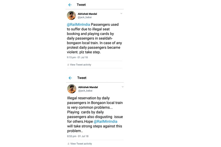 বনগাঁ লোকালের যাত্রী পেশায় তথ্যপ্রযুক্তি কর্মী অভিষেক মণ্ডল। রবিবার রাত ৯টা নাগাদ রেলমন্ত্রককে পর পর দু’টি টুইট করেছেন অভিষেক। বনগাঁ লোকালের কামরায় বেআইনি ভাবে সিট বুকিং, চলন্ত ট্রেনে অন্য যাত্রীদের অসুবিধায় ফেলে তাসের আসর বসানোর কথা জানিয়েছেন তিনি। ইতিমধ্যেই রেলমন্ত্রক আরপিএফকে পদক্ষেপ করতে নির্দেশ দিয়ে টুইট করেছে বলে জানতে পেরেছেন তিনি।