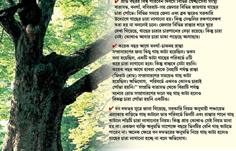 প্রতি বছর বিশ্ব পরিবেশ দিবসে বৃক্ষরোপণ হয় ঘটা করে। কিন্তু তারপরে নতুন পোঁতা সেই চারার খোঁজ ক’জন রাখে? উত্তর ২৪ পরগনার আয়তনের তুলনায় গাছের অনুপাত মাত্র ০.৯৫৭ শতাংশ, যেখানে থাকার কথা ৩৩ শতাংশ। বন দফতর সূত্রের খবর, জেলায় গাছের পরিমাণ অন্তত ১ শতাংশ করার চেষ্টা চলছে।“নির্বিচারে গাছ কাটা হচ্ছে। কিন্তু সেই তুলনায় নতুন গাছ লাগানো হচ্ছে না।”