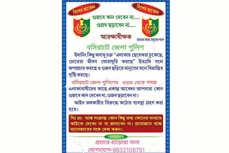 বসিরহাটের এসডিপিও আশিস মৌর্য বলেন, ‘‘সোশ্যাল মিডিয়ায় গুজব ছড়ানোর কারণে মানুষ ভুল বুঝছেন। দোষীদের চিহ্নিত করা হচ্ছে। গুজবে কান না দেওয়ার জন্য পোস্টারের মাধ্যমে প্রচার চলছে। কোনও রকম সন্দেহ হলে তা সঙ্গে সঙ্গে পুলিশকে জানানোর পরামর্শ দেওয়া হচ্ছে। আইন নিজের হাতে তুলে নেবেন না, এই অনুরোধ জানানো হচ্ছে মানুষকে।’’