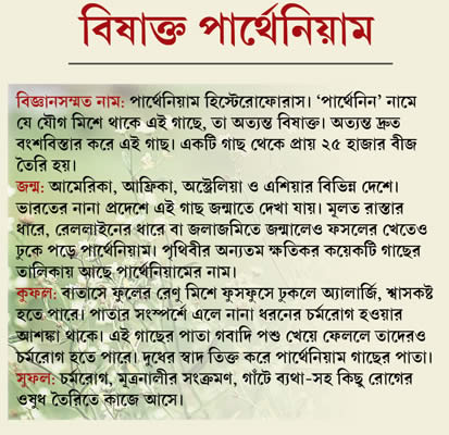 বিষাক্ত পার্থেনিয়াম গাছ সম্পর্কে গ্রামের মানুষকে সচেতন করার কাজও করছেন। জনপ্রতিনিধিদের পথে নামতে দেখে বহু গ্রামবাসীও এগিয়ে এসেছেন। স্কুল শিক্ষক, ব্যাঙ্ক কর্মী, সরকারি কর্মী বা স্কুল পড়ুয়ারাও আগাছা সাফ করার কাজে হাত লাগাচ্ছেন। সহযোগিতা মিলেছে ব্লক প্রশাসনের কাছ থেকেও। বিডিও মালবিকা খাটুয়া বলেন, ‘‘সকলে মিলে দূষণমুক্ত এলাকা গড়ে তুলতে মিশন নির্মল বাংলা প্রকল্পে খুবই ভাল কাজ করছেন। আমরা ওঁদের সব রকমের সাহায্য করছি।’’