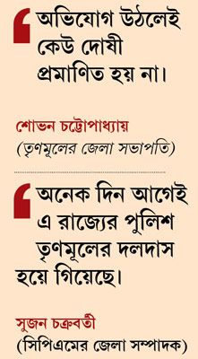 কিন্তু দুই এলাকার বিক্ষুব্ধ তৃণমূল নেতাকর্মীরা অন্য কথা বলছেন। তাঁদের বক্তব্য, এই ঘটনায় ভোটের বাজারে দলেরই ভাবমূর্তি খারাপ হচ্ছে। দল যদি অভিযুক্তদের আত্মসমর্পণেরও নির্দেশ দিত, তা হলেও মুখরক্ষা হতো। কুলপির তৃণমূল নেতা রবীন্দ্রনাথ কোলে বলেন, ‘‘সত্যেন অধিকারীর মতো নির্বাচিত প্রতিনিধি যে ভাবে এক কোটিরও বেশি টাকা চুরি করেছেন তাতে গরিব মানুষ কাজ পাচ্ছেন না। সরকারি প্রকল্পে বাড়ি পাচ্ছেন না। এ সব কারণে আমরা অনেকেই বসে গিয়েছি। দলের থেকে মুখ ফিরিয়ে নিয়েছি।’’ বিরোধীরা অবশ্য অভিযুক্ত দুই তৃণমূল নেতাকে এলাকায় দেখে অবাক নন। তাঁদের মতে, তৃণমূল জমানায় এটাই দস্তুর। কমিশনের নজরদারি সত্ত্বেও তাই ওই দু’জনকে ধরতে পুলিশ ‘ঢিলেঢালা মনোভাব’ দেখাচ্ছে। জেলা সিপিএম সম্পাদক সুজন চক্রবর্তী বলেন, ‘‘অনেক দিন আগেই রাজ্যের পুলিশ তৃণমূলের দলদাস হয়ে গিয়েছে। তৃণমূল নেতাদের ওরা ধরবে কী করে?’’ জেলা কংগ্রেস সভাপতি অর্ণব রায়ের আশঙ্কা, ভোটের সময় দুই নেতা প্রভাব খাটানোর চেষ্টা করতে পারেন।