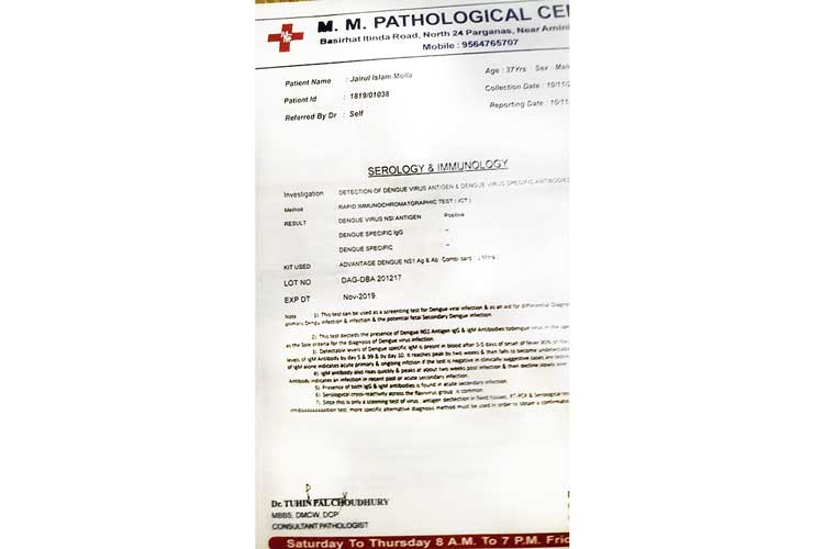 স্থানীয় ব্যবসায়ী অসীম দে জানান, তিনি ডেঙ্গিতে আক্রান্ত হয়ে প্রথমে বসিরহাট জেলা হাসপাতালে এক সপ্তাহ, পরে কলকাতার আর জি কর হাসপাতালে ১৯ দিন চিকিৎসাধীন থাকার পর বাড়ি ফিরেছেন।