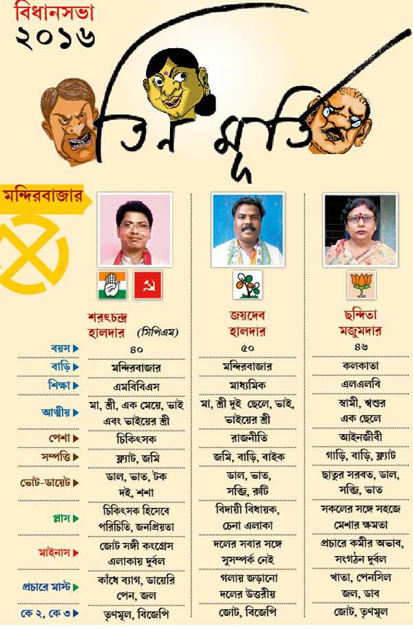 মন্দিরবাজার বিধানসভা কেন্দ্রের তিন প্রধান প্রার্থীর সম্পর্কে কিছু তথ্য এক নজরে। মন্দিরবাজার বিধানসভা কেন্দ্রের তিন প্রধান প্রার্থীর সম্পর্কে কিছু তথ্য এক নজরে।