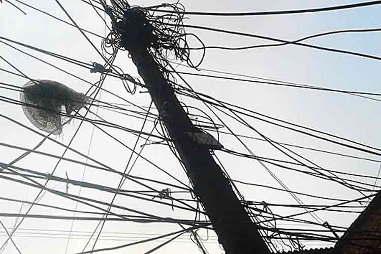 বাজারের মধ্যে তারের জট। নিজস্ব চিত্র