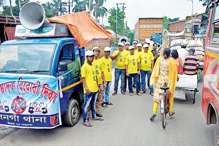 ঘুরে-দাঁড়িয়ে: মাদকাসক্ত ছিলেন এঁরা। ফিরে এসেছেন সমাজের মূল স্রোতে। মঙ্গলবার বনগাঁর রাস্তায় মাদক-বিরোধী দিবসে ট্যাবলোও বের করলেন। ছবি: নির্মাল্য প্রামাণিক