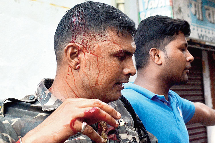 গন্ডগোলে মাথা ফাটল পুলিশের। ভাটপাড়ায়। ছবি: সজল চট্টোপাধ্যায়