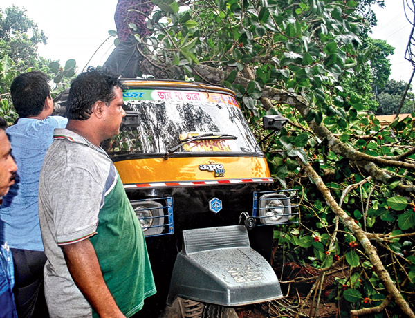 অটোর উপরে উল্টে পড়ে ভাঙা ডাল।