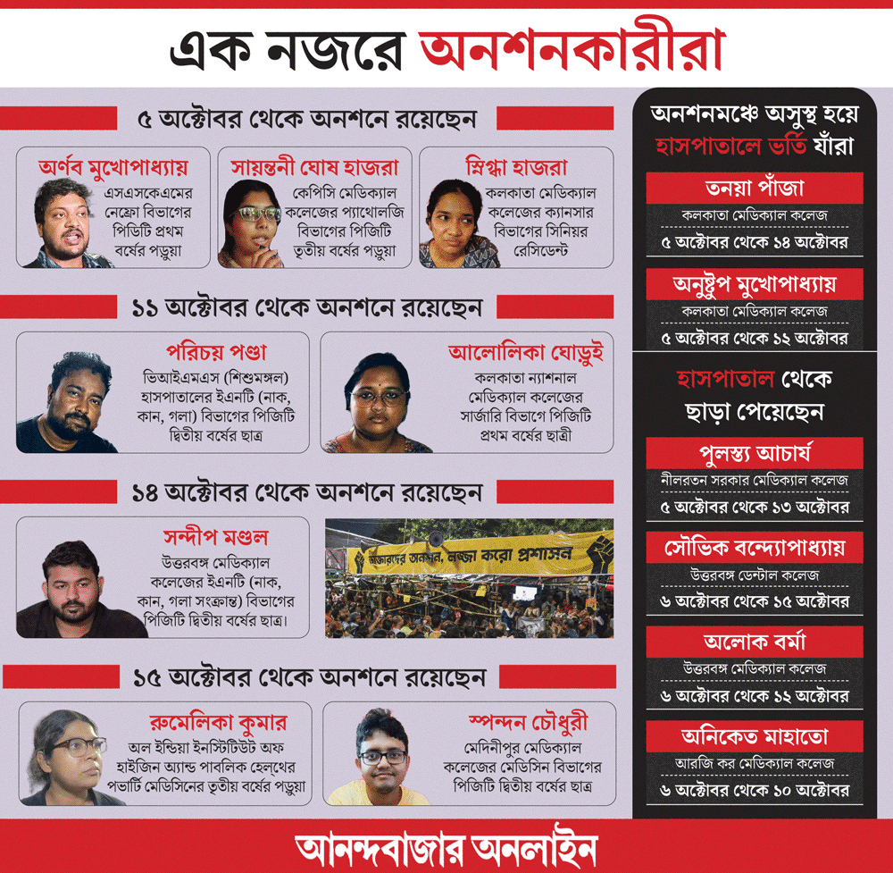 আরজি করের নির্যাতিত মহিলা চিকিৎসকের জন্য ন্যায়বিচার, হাসপাতালের নিরাপত্তা এবং পরিকাঠামোগত বিষয়ে মোট ১০ দফা দাবিতে ‘আমরণ অনশন’ চালিয়ে যাচ্ছেন জুনিয়র ডাক্তারেরা। কলকাতার ধর্মতলা এবং উত্তরবঙ্গের শিলিগুড়ি— দু’জায়গাতেই চলছে অনশন। অসুস্থ হয়ে পড়েছেন একাধিক জুনিয়র ডাক্তার। কেউ হাসপাতাল থেকে ছাড়া পেয়েছেন, কেউ এখনও ভর্তি রয়েছেন।