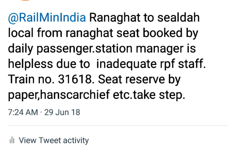আরপিএফের রানাঘাট পোস্টের ইনস্পেক্টর অসীম দাস বলেন, “সুশোভনবাবুর টুইট পেয়ে রেলমন্ত্রক আমাদের জানায়। তার পরেই অভিযান চলে।’’ সুশোভন বলেন, ‘‘খবরের কাগজ, রুমাল, বোতল, ব্যাগ, চশমা দিয়ে ট্রেনে বসার জায়গা আটকানো দীর্ঘদিন ধরে চলছে। রেল মন্ত্রক যে দ্রুততায় ব্যবস্থা নিল, তাতে আমার মতো যাত্রীরা আশ্বস্ত হবেন।’’
