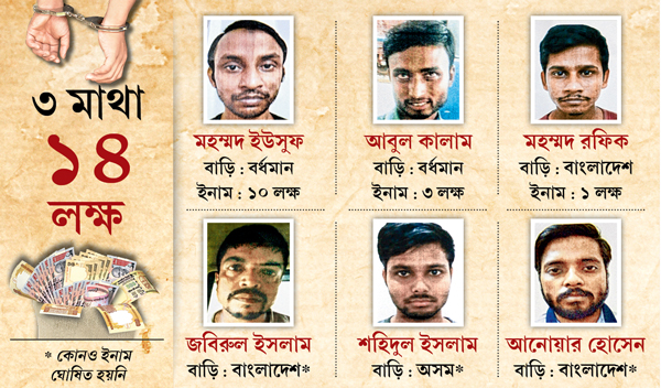 সোমবার কলকাতা পুলিশের যুগ্ম কমিশনার (এসটিএফ) বিশাল গর্গ জানান, অসম ও পশ্চিমবঙ্গের বিভিন্ন জায়গা থেকে ওই ছ’জনকে গ্রেফতার করা হয়েছে। ধৃতদের মধ্যে রয়েছে বর্ধমানের বাসিন্দা, জেএমবি-র শীর্ষ সংগঠকদের অন্যতম মহম্মদ ইউসুফ। খাগড়াগড় বিস্ফোরণের পর থেকেই সে ফেরার। ইউসুফকে পেতে ১০ লক্ষ টাকা ইনাম ঘোষণা করেছিল জাতীয় তদন্তকারী সংস্থা (এনআইএ)। ধৃতদের মধ্যে রয়েছে বর্ধমানের আবুল কালাম ও বাংলাদেশি নাগরিক মহম্মদ রফিক। আবুলের হদিস পেতে তিন লক্ষ ও রফিকের জন্য এক লক্ষ টাকা পুরস্কার ঘোষণা করা হয়। সেই হিসেবে পুজোর মুখে ১৪ লক্ষ টাকা ‘বোনাস’ পেল কলকাতা পুলিশ। ২০১৪-র নভেম্বরে জেএমবি-র বর্ধমান মডিউলের চিফ মাসুদ রানাকে গ্রেফতার করে ১০ লক্ষ টাকা পায় বিধাননগর কমিশনারেট। বিধাননগরের তৎকালীন পুলিশ কমিশনার রাজীব কুমারই এখন কলকাতার পুলিশ কমিশনার!