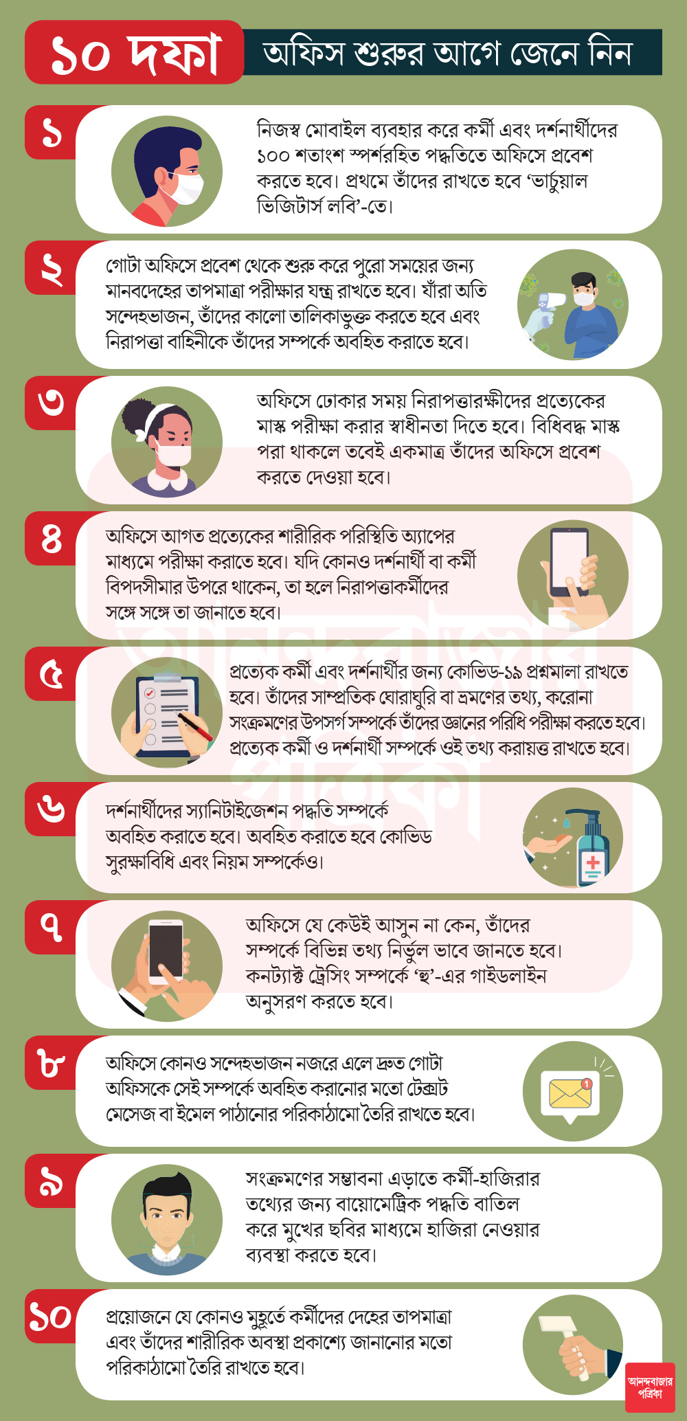 কেউ দেখা করতে চাইলে ১০০ শতাংশ স্পর্শরহিত পদ্ধতিতে তাঁকে ‘ভার্চুয়াল ভিজিটার্স লবি’-তে এনে বসাতে হবে। দর্শনার্থীরা তাঁদের মোবাইলে কিউ-আর কোড স্ক্যান করে সেখানে ঢুকবেন। দ্বিতীয়ত, প্রবেশপথে দর্শনার্থীদের দেহের তাপমাত্রা মাপার জন্য স্ক্যান মেশিন বসাতে হবে। নিরাপত্তারক্ষীদের বলতে হবে ভাল করে মাস্ক পরীক্ষা করার জন্য। তাঁরা ছাড়পত্র দিলে তবেই দর্শনার্থীদের অফিসে ঢুকতে দেওয়া হবে। প্রত্যেক দর্শনার্থীকে ‘আরোগ্য সেতু’ অ্যাপে নিজেদের শরীরের অবস্থা সম্পর্কে কর্তৃপক্ষকে অবহিত করতে হবে। কেউ সন্দেহভাজন হলে সঙ্গে সঙ্গে নিরাপত্তারক্ষীদের সতর্ক হতে হবে। দর্শনার্থীদের প্রত্যেকে সম্প্রতি কোথায় কোথায় গিয়েছেন, তা-ও পরীক্ষা করতে হবে।