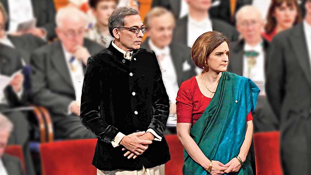 বাস্তবে বাঙালির মনীষার সবচেয়ে উজ্জ্বল স্বীকৃতি এ বার বাংলার ছেলে, হার্ভার্ডের অধ্যাপক অভিজিৎ বিনায়ক বন্দ্যোপাধ্যায়ের নোবেল প্রাপ্তি। তাঁর সঙ্গেই যুগ্ম প্রাপক তাঁর স্ত্রী এস্থার দুফলো। স্টকহলমে নোবেল পদক প্রদানের মঞ্চে ধুতি-পঞ্জাবি পরা অভিজিৎ এবং শাড়ি পরা ‘বঙ্গ-বধূ’ এস্থার আমাদের অহঙ্কার বাড়িয়ে দেন।