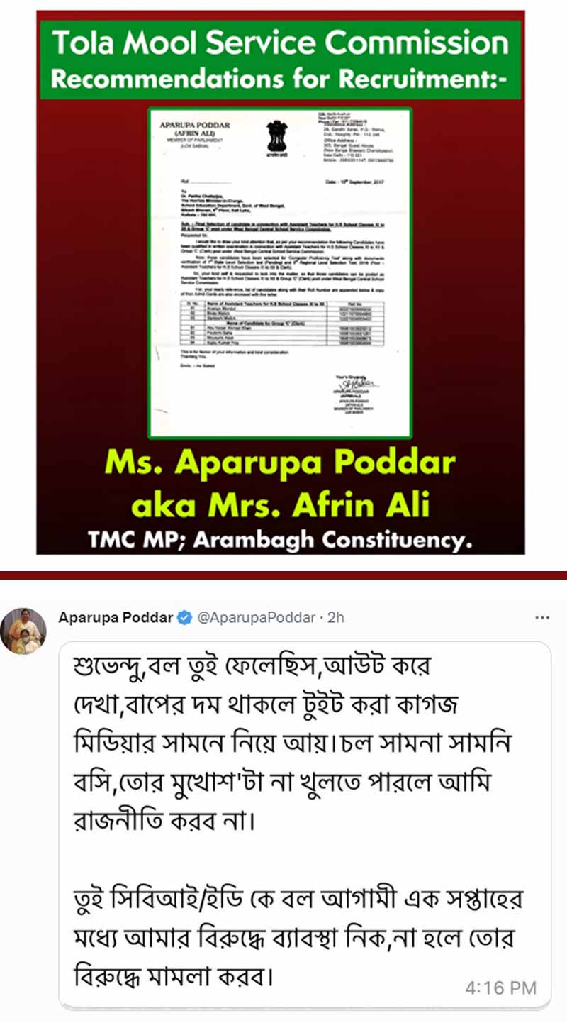 শুক্রবার একটি টুইট। তার জল গড়াল বিকেলেও। সকাল ১০টা নাগাদ একটি টুইট করে বিরোধী দলনেতা শুভেন্দু অধিকারী দাবি করেছিলেন, তৃণমূলের একাধিক বিধায়ক এবং সাংসদ নিয়োগ দুর্নীতির সঙ্গে যুক্ত। দাবির সপক্ষে ৪টি চিঠি তুলে ধরেন তিনি। সেই সমস্ত চিঠিতে দেখা যায় তৃণমূলের জনপ্রতিনিধিরা নির্দিষ্ট চাকরিপ্রার্থীদের নাম করে তাঁদের চাকরি দেওয়ার প্রস্তাব করছেন। যদিও আনন্দবাজার অনলাইন এই চিঠিগুলির সত্যতা যাচাই করেনি। শুভেন্দুর নিশানায় ছিলেন আরামবাগের তৃণমূল সাংসদ অপরূপা পোদ্দার, মুর্শিদাবাদের তৃণমূল সাংসদ আবু তাহের, রাজ্যের কারামন্ত্রী তথা রামনগর কেন্দ্রের বিধায়ক অখিল গিরি এবং বর্ধমান উত্তর কেন্দ্রের তৃণমূল বিধায়ক নিশীথকুমার মালিক। এঁদের মধ্যে ৩ জন শুভেন্দুর অভিযোগ প্রসঙ্গে মুখ না খুললেও বিরোধী দলনেতার বিরুদ্ধে সরব হন অপরূপা। সরাসরি চ্যালেঞ্জ ছুড়ে বলেন, ‘‘দম থাকলে টুইট করা কাগজ মিডিয়ার সামনে নিয়ে আয়, আমায় আউট করে দেখা।’’