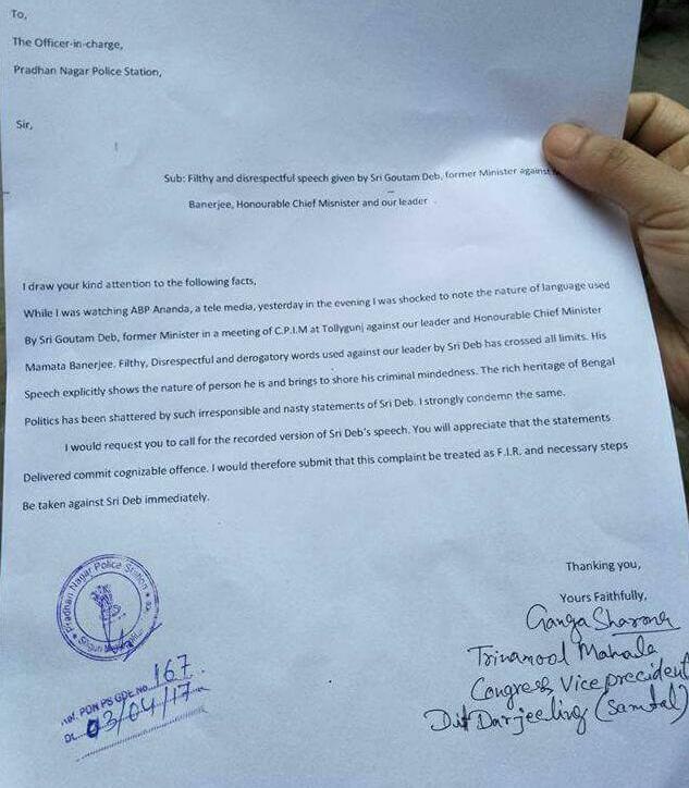 প্রকাশ্য জনসভায় মমতা বন্দ্যোপাধ্যায়ের নামে কুরুচিকর মন্তব্য করায় সিপিএম নেতা গৌতম দেবের বিরুদ্ধে নিন্দার ঝড় উঠেছে। এই বিষয়ে অভিযোগ জানিয়ে আগেই তাঁর বিরুদ্ধে বেশ কয়েকটি এফআইআর দায়ের করা হয়েছে। এ বার শিলিগুড়ির প্রধাননগর থানাতেও গৌতমবাবুর বিরুদ্ধে এফআইআ করা হল।