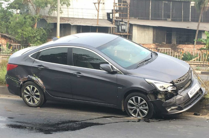 দুর্ঘটনায় হিরণের গাড়ির পিছনের অংশ দুমড়ে যায়। —নিজস্ব চিত্র।