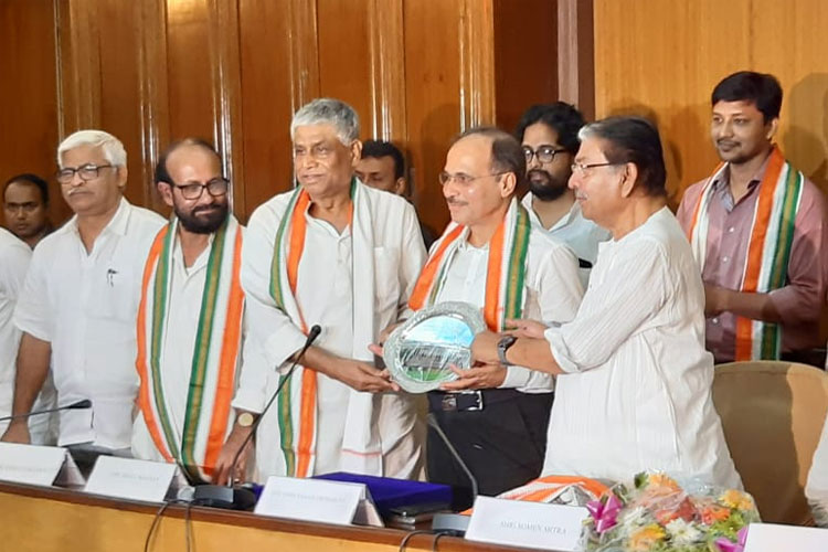 অধীর চৌধুরীকে সংবর্ধনা কংগ্রেস পরিষদীয় দলের। বিধানসভার নৌশদ আলি কক্ষে। বুধবার। —নিজস্ব চিত্র।