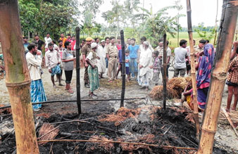 পুড়ে যাওয়া ঘরের সামনে এক নাগাড়ে কেঁদে চলেছেন অমিছা বিবি। গ্রামের লোকজন ভিড় করে আছেন চারিদিকে। সারা রাত ধরে এ ভাবেই ভিড় করেছিলেন তাঁরা। কারও আর ঘুম হয়নি রাতে। নাওয়া-খাওয়া যেন সব ভুলে গিয়েছে মশালডাঙা ছিটমহলের বাসিন্দারা।