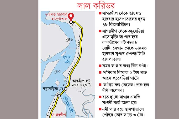 কচুবেড়িয়া থেকে মুড়িগঙ্গা পার হয়ে কাকদ্বীপ (৭৮ কিলোমিটার) থেকে সড়কপথে যেতে হয় ডায়মন্ড হারবার হাসপাতাল। ওই নদীপথটি গুরুত্বপূর্ণ। কারণ, পলি জমে মুড়িগঙ্গায় ভেসেল বা বার্জ চলাচলে সমস্যা হচ্ছে দীর্ঘদিন ধরে। জোয়ার থাকলে ভেসেল-বার্জ চলে। কিন্তু ভাটায় দু’পাড়ের যোগাযোগ থাকে না। দিনচারেক আগে মাঝ নদীতে একটি যাত্রিবাহী ভেসেল আটকে পড়েছিল। উপকূলরক্ষী বাহিনী যাত্রীদের উদ্ধার করে। রক্তদান শিবিরের আয়োজক সংস্থার কর্মী মৃণালকান্তি বালা জানান, শনিবার রক্তের গাড়িটি যখন কচুবেড়িয়ায় পৌঁছয়, তখন বার্জ-ভেসেল চলাচল বন্ধ হয়ে গিয়েছে।