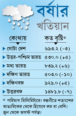 দিল্লির মৌসম ভবনের তথ্য বলছে, অগস্ট মাসের শেষে এসে উত্তরবঙ্গে সাত শতাংশ কম বৃষ্টি হয়েছে। স্বাভাবিকের থেকে কিছু কম হলেও চাষের সমস্যা হবে না বলেই মনে করছেন কৃষি বিশেষজ্ঞরা। আবহাওয়া দফতরের খবর, গত দু’দিন ধরে একটি ঘূর্ণাবর্তের জেরে তরাই-ডুয়ার্স এলাকায় ভারী বৃষ্টি হয়েছে। শুক্রবার বানারহাটে এক দিনে ২৫০ মিলিমিটার বৃষ্টি রেকর্ড করা হয়েছে। প্রবল বৃষ্টি হয়েছে ময়নাগুড়ি, জলপাইগুড়ি, হাসিমারায়। সেচ দফতর সূত্রের খবর, জলঢাকা, সঙ্কোশ, তোর্সার জলস্তর বেড়েছে।