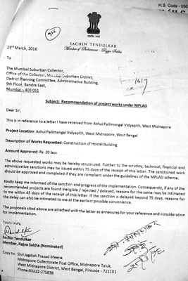 এ বার জানা গেল, জেলারই গোপীবল্লভপুর-১ ব্লকে আশুই পল্লিমঙ্গল বিদ্যাপীঠে আদিবাসী পড়ুয়াদের হস্টেল তৈরির জন্য টাকা দিয়েছেন সচিন। তাঁর বরাদ্দ করা ২০ লক্ষ টাকা এখনও স্কুল কর্তৃপক্ষের হাতে আসেনি। তবে গত ২৩ মার্চ জেলাশাসকের কাছে অর্থ বরাদ্দের খবর জানিয়ে চিঠি পাঠিয়েছেন মাস্টার ব্লাস্টার। তাঁর প্যাডে লেখা সেই চিঠির প্রতিলিপি পৌঁছেছে স্কুলেও। টেন্ডার ডেকে ঠিকাদার নিয়োগ করতে বলেছে জেলা প্রশাসন। অর্থাৎ হস্টেলের কাজ শুরু হওয়া এখন সময়ের অপেক্ষা।
