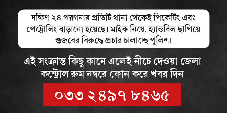 পুলিশ বিষয়টিকে অত্যন্ত গুরুত্ব দিয়ে দেখছে। গুজব ছড়ালে বা আতঙ্কের পরিবেশ তৈরির চেষ্টা করলে অথবা কোনও গণপিটুনির ঘটনা ঘটলে সঙ্গে সঙ্গে পুলিশে খবর দেওয়ার নির্দেশ দেওয়া হয়েছে। এই বিষয়ে জেলা পুলিশ কন্ট্রোল রুমের ফোন নম্বর (০৩৩ ২৪৯৭ ৮৪৬৫) জানিয়ে বলা হয়েছে সেখানে যোগাযোগের কথা।
