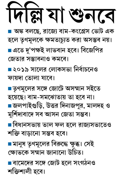 একে একে আজ দিল্লি পৌঁছে প্রদীপবাবুর বাড়িতে আলোচনায় বসে প্রদেশ নেতারা স্বীকার করে নেন, তৃণমূলকে পাল্টা চ্যালেঞ্জ দিতে গেলে জোটই প্রয়োজন। সহজ পাটিগণিতের হিসাব বলছে, রাজ্যের বেশ কিছু আসনে (বিশেষত, উত্তরবঙ্গ ও মুর্শিদাবাদে) কংগ্রেস ও বাম ভোট এক জায়গায় হলে তৃণমূলকে বেকায়দায় ফেলা সম্ভব। এমনকী, ক্ষমতা দখলের দৌড়ে তৃণমূলকে শক্ত চ্যালেঞ্জে ফেলাও সম্ভব। আর বিধানসভায় দলের শক্তি বৃদ্ধির ফায়দা যে আগামী লোকসভা নির্বাচনেও পাওয়া যাবে, সেই যুক্তি রাহুলকে জানাতে চান অধীরেরা। প্রদীপবাবুর বক্তব্য, তৃণমূলের সর্বাত্মক বিরোধিতার প্রশ্নে প্রদেশ কংগ্রেস নেতৃত্বের মত এখন সর্বসম্মতই। তবে বামেদের হাত ধরলে সিপিএম কংগ্রেসকে গিলে ফেলবে কি না, সাম্প্রতিক ‘শিলিগুড়ি মডেলে’র উদাহরণ দিয়ে সেই আশঙ্কার কথাও আজকে তুলেছিলেন মানস ভুঁইয়া। তাঁকে সমর্থন করেন দীপা দাশমুন্সি ও অভিজিৎ মুখোপাধ্যায়। কিন্তু দিনের শেষে তাঁদেরও বক্তব্য, সংখ্যাগরিষ্ঠতার ভিত্তিতে হাইকম্যান্ড যা সিদ্ধান্ত নেবে, তা-ই শিরোধার্য।