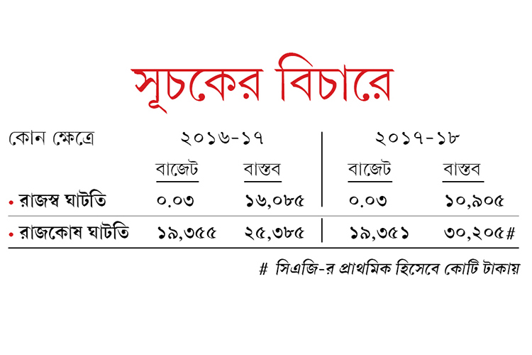 সিএজি বলছে, বিশাল অঙ্কের এই আর্থিক দায় শুধু নয়, খরচে রাশ টানতে না পারায় বেড়েছে রাজস্ব ঘাটতি। ২০১৭-১৮ সালে বাজেটে মাত্র ৩ লাখ টাকা ঘাটতির দাবি করা হলেও বছর শেষে তা দাঁড়িয়েছে ১০ হাজার ৯০৬ কোটিতে। ধারের এই সংসারে স্বাভাবিক কারণেই বেড়েছে ফিসক্যাল ডেফিসিট বা রাজকোষ ঘাটতি। যে ঘাটতি ১৯ হাজার কোটিতে ধরে রাখা যাবে বলে অর্থ দফতর ভেবেছিল, তা বছরশেষে ৩০ হাজার ২০৫ কোটি হয়েছে বলে জানিয়েছে সিএজি।