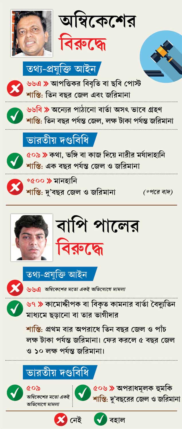 অম্বিকেশের চেয়েও কড়া ধারা প্রযুক্ত রয়েছে বাপি পালের বিরুদ্ধে। ৬৬এ তো ছিলই, তৃণমূল সমর্থক পরিবারের ছেলেটিকে পুলিশ বিদ্ধ করেছিল তথ্য-প্রযুক্তি আইনের ৬৭ (বৈদ্যুতিন মাধ্যমে বিকৃত কামনার বার্তা প্রচার) এবং ভারতীয় দণ্ডবিধির ৫০৬ (অপরাধমূলক হুমকি ও ভীতি প্রদর্শন) ও ৫০৯ ধারাতেও। ৬৬এ বাদ গেলেও অন্যগুলোয় দোষী সাব্যস্ত হলে মালদহের চাঁচলের বাসিন্দা যুবকটির সর্বোচ্চ তিন বছরের সাজা হতে পারে। বাপি যদিও আশাবাদী। “আমার বিরুদ্ধে মূল অভিযোগ ছিল ৬৬এ-তে। সেটা বাতিল হওয়ায় আশা করছি, অন্য ধারাগুলো সরকার তুলে নেবে,” বুধবার বলেন বাপি।