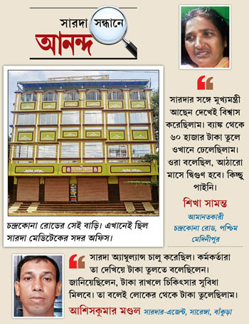 মেডিটেক পা ফেলার পরে জঙ্গলমহলে সারদার লগ্নি-কারবার কতটা ফুলে-ফেঁপে উঠেছিল, সংস্থার এক প্রাক্তন পদাধিকারীর কথায় তার আঁচ মিলেছে। তিনি জানান, ২০১১-র আগে তিন জেলায় সারদার অফিস ছিল সাকুল্যে ১৮টি। আমানত আসত নামমাত্র। কিন্তু মেডিটেক উদ্বোধনের পরে মোট ৬৫টি অফিস গজিয়ে ওঠে। পরবর্তী এক বছরে শুধু এই তিন জেলা থেকে সারদা মোট ১৪৮ কোটি টাকা তুলেছে বলে তাঁর দাবি। খড়্গপুরের এজেন্ট শ্যামল বিশ্বাসের আক্ষেপ, “বলা হয়েছিল, রাজ্য সরকার পাশে আছে। স্বয়ং মুখ্যমন্ত্রী আমাদের সঙ্গে। জনগণের টাকা মার যাওয়ার ভয় নেই। আমরাও মানুষকে তা-ই বুঝিয়েছি। এখন দেখছি, পুরোটাই চক্রান্ত ছিল!”