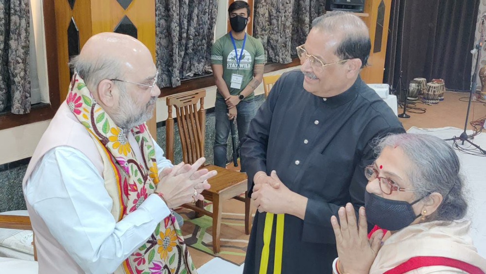 পণ্ডিত অজয় চক্রবর্তীর গানের স্কুলে অমিত শাহ। নিজস্ব চিত্র।