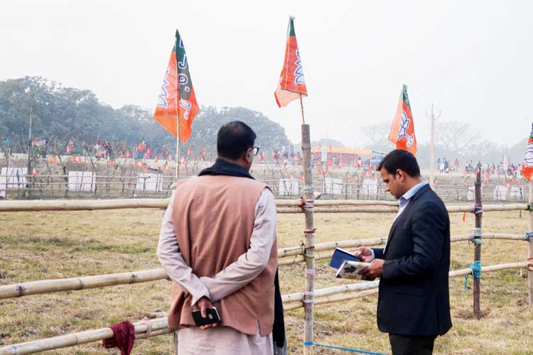 পরিদর্শন: কেন্দ্রীয় নেতৃত্বের তরফে সভাস্থলের নিরাপত্তা খতিয়ে দেখছেন রাজ্য বিজেপির সহ পর্যবেক্ষক অরবিন্দ মেনন (বাঁ দিকে)। নিজস্ব চিত্র