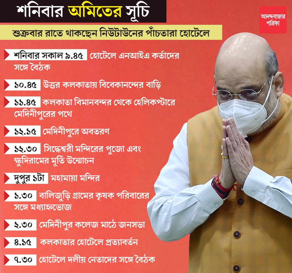 কেন্দ্রীয় নিরাপত্তা বলয়ের পাশাপাশি অমিতের শনি এবং রবিবারের রাজ্যসফরে আঁটোসাঁটো নিরাপত্তার বন্দোবস্ত করা হচ্ছে। আগেই এ বিষয়ে রাজ্য পুলিশের ডিজি বীরেন্দ্রকে চিঠি দিয়েছে সিআরপিএফ। বিজেপি সভাপতি জেপি নড্ডার কনভয়ে হামলার পর অমিতের নিরাপত্তা নিয়ে আরও কড়াকড়ি করছে কেন্দ্রীয় সরকার। শনিবার মেদিনীপুর কলেজ মাঠে জনসভা করবেন অমিত। এনআই-এর সঙ্গে বৈঠকের পর কেন্দ্রীয় স্বরাষ্ট্রমন্ত্রী উত্তর কলকাতার সিমলায় স্বামী বিবেকানন্দের বাড়িতে যাবেন অমিত। মা সিদ্ধেশ্বরী মন্দির এবং দেবী মহামায়া মন্দিরেও তাঁর পুজো দেওয়ার কথা। রবিবার অমিত বোলপুরে একটি রোড-শো করবেন। সেখান থেকে বিশ্বভারতী বিশ্ববিদ্যালয় এবং শান্তিনিকেতন পরিদর্শন করবেন। বীরভূমের শ্যামবাটিতেতে বাউল পরিবারের সাথে তিনি মধ্যাহ্নভোজন করবেন বলে খবর। গোটা কর্মসূচিতে রাজ্যের তরফে যথাযথ এবং নিশ্ছিদ্র নিরাপত্তার ব্যবস্থা করা হয়েছে।