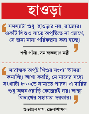 ওই সব শিশুর দেখা মিলছে কলকাতার অপর পাড়ে, হাওড়া জেলায়। মুখ্যমন্ত্রী মমতা বন্দ্যোপাধ্যায় যেখানে স্বাস্থ্য ও শিক্ষায় ৯০ শতাংশ কাজ হয়ে গিয়েছে বলে প্রায়ই দাবি করেন, সেখানে গত জানুয়ারি মাসে শুধু হাওড়া জেলা সমাজকল্যাণ দফতরের সমীক্ষাতেই উঠে এসেছে ১০৭৫টি শিশুর কথা। তাই তাদের ‘লাল’ তালিকাভুক্ত করা হয়েছে। অর্থাৎ, ‘মারাত্মক অপুষ্ট শিশু’। এদের মধ্যে সবচেয়ে বেশি ওই রকম শিশু মিলেছে ডোমজুড় (১৯৪টি), সাঁকরাইল (১৭০টি) এবং উলুবেড়িয়া-২ ব্লকে (১১৮টি)।