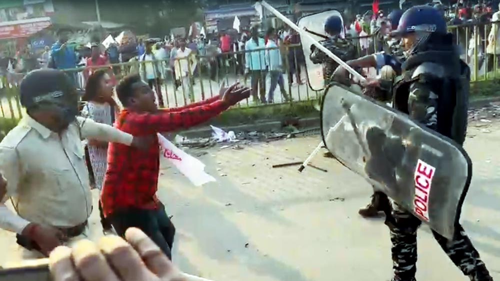 পুলিশকে লক্ষ্য করে ইট বৃষ্টি বিক্ষোভকারীদের। বিক্ষোভকারীদের নিয়ন্ত্রণে আনতে লাঠিচার্জ করল পুলিশ। ফাটানো হল কাঁদানে গ্যাসের সেল।
