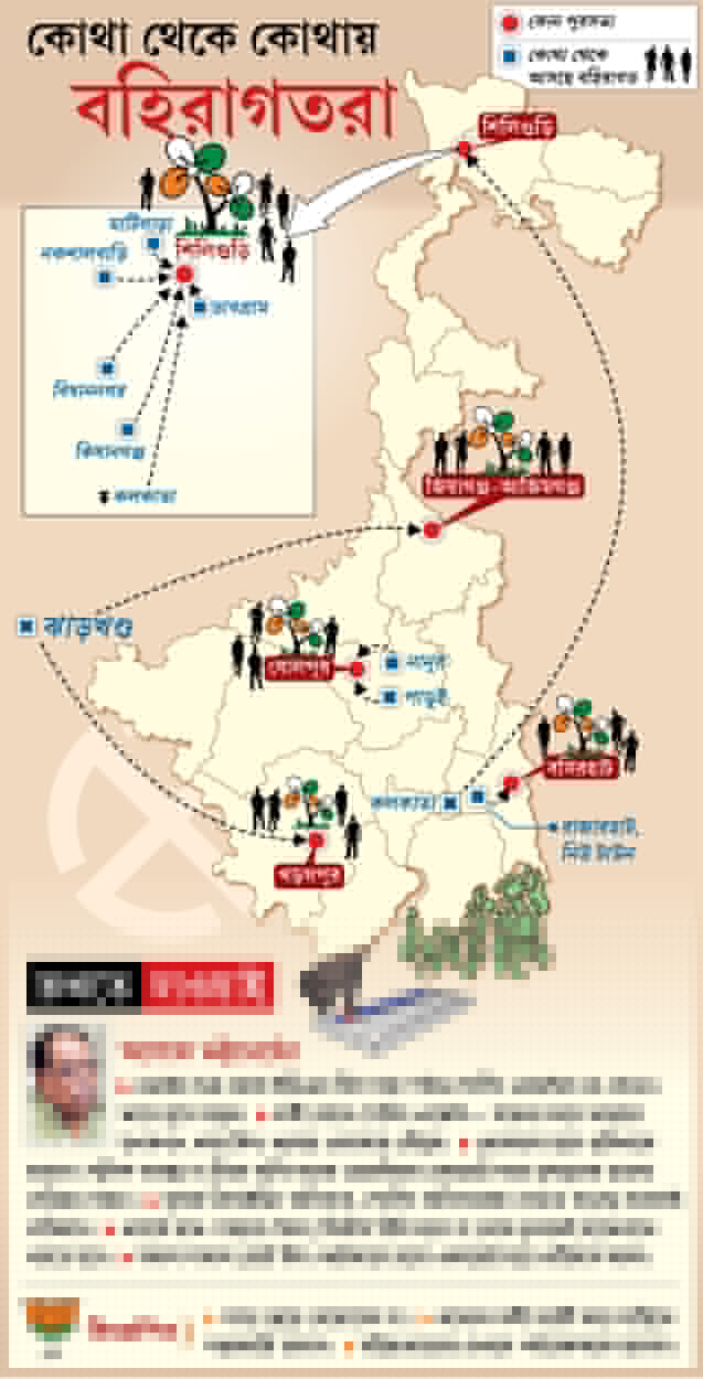 বাইক-বাহিনীর নজরদারি, চাপা স্বরে হুমকি, চোরাগোপ্তা দলীয় কার্যালয়ের দখলদারি—সন্ত্রাসের চেনা আবহে শিলিগুড়ি পুর-নির্বাচনের চব্বিশ ঘণ্টা আগে দোসর হয়েছে ‘বহিরাগত’র অনুপ্রবেশ।