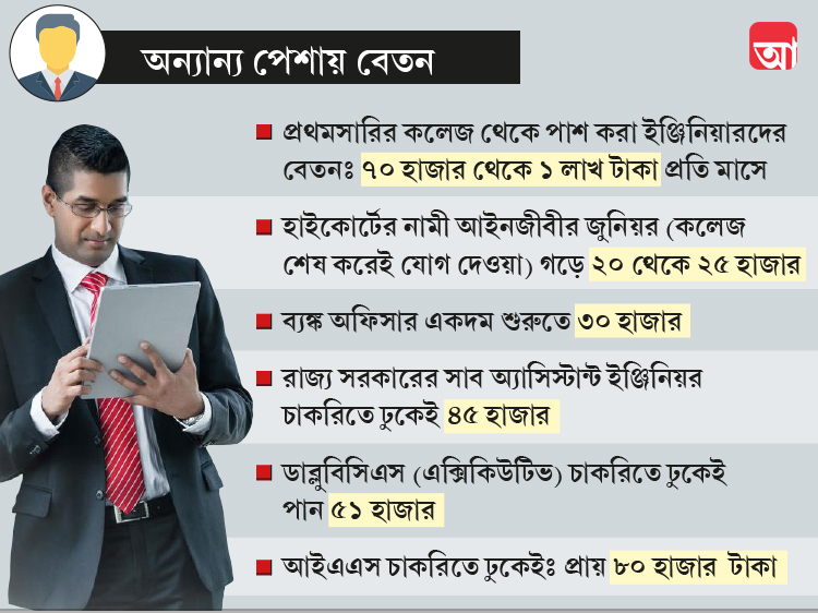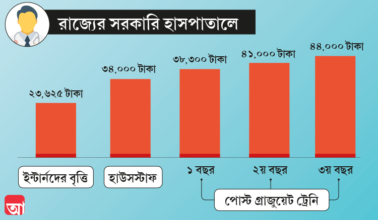 এ সব দেখে মাঝে মাঝেই আমার ছেলে প্রচণ্ড হতাশায় ভোগে। ছেলে ইন্টার্নশিপ শুরু করার পর ওদের বৃত্তির টাকার পরিমাণ কিছুটা বেড়ে হল সাড়ে ২৩ হাজার টাকা। এখন হাউস স্টাফ হিসাবে পায় ৩৮ হাজার টাকা। ওর এক স্কুলের বন্ধু ইঞ্জিনিয়ারিং পড়েছে। ও উচ্চশিক্ষার জন্য বিদেশে যাওয়ার প্রস্তুতি নিচ্ছে। তার মাঝেই একটা চাকরি করছে। বছরে ১৩ লাখ টাকার প্যাকেজ। মেধার কথা যদি ধরেন, তা হলে তো ওই ছেলেটির থেকে আমার ছেলের মেধা, কাজের গুরুত্ব, ঝুঁকি কম নয়— বরং বেশি। এক জন সাধারণ গ্রাজুয়েটও প্রতিযোগিতামূলক পরীক্ষা দিয়ে চাকরি পেলে ওদের থেকে বেশি টাকা বেতন পায়। ওদের ঠিকঠাক থিতু হতে তিরিশ পেরিয়ে যায়। অন্য পেশায় সেই বয়সে অনেকটা ধাপ এগিয়ে যাওয়া যায়।