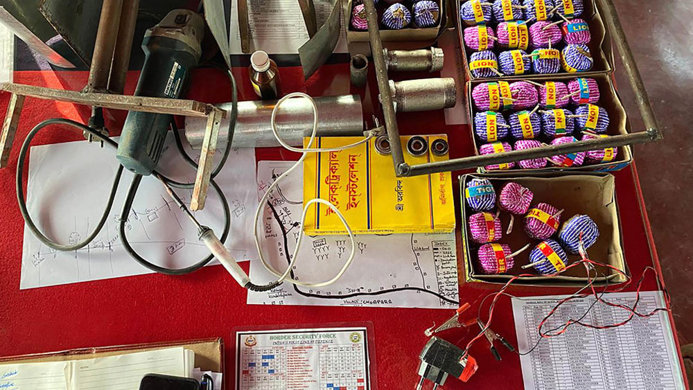 ধৃতদের কাছ থেকে উদ্ধার বাজি, আইইডি তৈরির সরঞ্জাম, ধারাল অস্ত্র। ছবি -পিটিআই