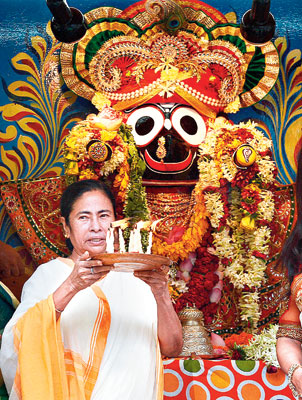 আরতি। ইস্কনের রথযাত্রায় মুখ্যমন্ত্রী মমতা বন্দ্যোপাধ্যায়। বুধবার বিশ্বনাথ বণিকের তোলা ছবি।